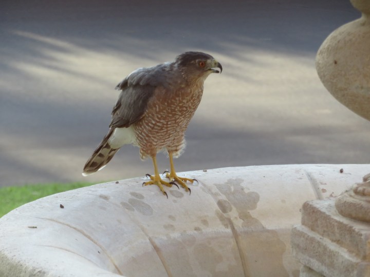 This Hawk likes drinking water from the fountain. Red-tailed Hawks are incredibly adaptable—they thrive in wild desert, suburban neighborhoods, and even golf courses (which the Coachella Valley has plenty of). They’re monogamous and often return to the same nest year after year.
